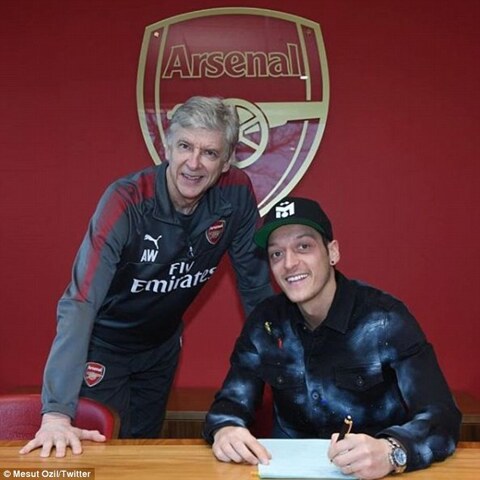 Following his contract renewal, Ozil took to Twitter to announce that he 'feels at home' at Arsenal, along with a picture of him signing his contract, sat next to manager.